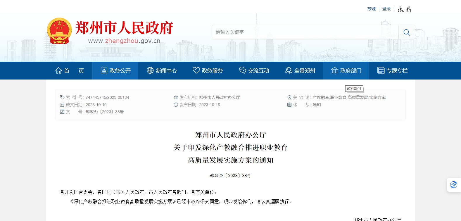 鄭州市人民政府辦公廳 關(guān)于印發(fā)深化產(chǎn)教融合推進職業(yè)教育 高質(zhì)量發(fā)展實施方案的通知